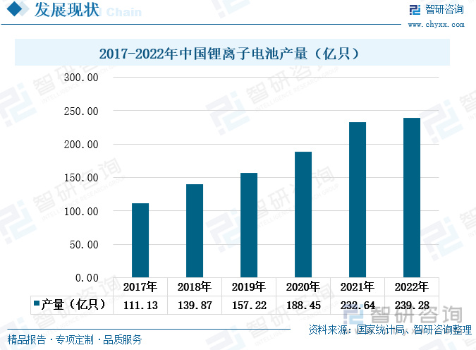 锂电池是锂最主要的下游应用领域,尤其近些年来,我国对于新能源产业出台了一系列的鼓励和扶持政策,推动我国新能源产业的快速发展,新能源汽车、储能设备等产业火热发展,这些产业对锂的需求量快速增长。锂电池是电池中的一种,由锂金属或锂合金作为其正极或负极材料。锂电池大致可分为锂金属电池和锂离子电池两类。其中锂金属电池一般是使用二氧化锰为正极材料、金属锂或其合金金属为负极材料。锂离子电池则一般是使用锂合金为正极材料,目前我国市场上主要以锂离子电池为主。2017年至2022年,我国锂离子电池的产量持续增多,2022年增长至239.28亿只,较上一年度增长了2.85%。
