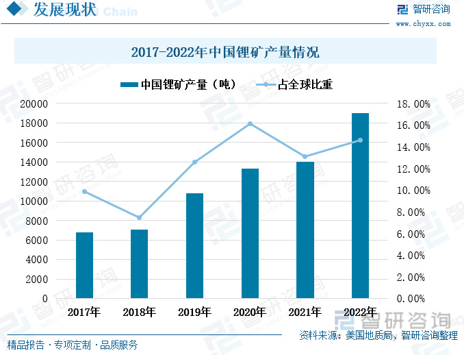 内容概要:2017年至2022年,我国锂矿产量稳定上涨,2022年上涨至19000吨,较上一年度增长了35.71%。近年来,在国家政策的鼓励和扶持下,我国新能源产业快速发展,尤其是新能源汽车市场,产需两旺,推动锂需求量持续增多。根据美国地质局的数据,2022年我国锂矿产量位居全球第三位,我国锂矿产量占全球总产量的14.62%,较上一年度增长了1.53个百分比。