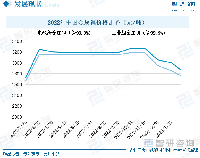 2022年我国金属锂的价格相对比较平稳。2022年3月份,金属锂价格上涨至每吨3100元至3200元,并基本稳定在这个价格区间内,到2022年10月,金属锂的价格出现小幅度的上涨后便呈现出下滑的趋势。2022年12月后,我国金属锂的价格持续下滑,到2023年1月底,我国金属锂的价格下降至每吨不足3000元。金属锂价格下滑主要是由于前期市场火热,投融资动态频繁,相关产能陆续释放,同时,受到经济下行压力的影响,2023年1月我国新能源汽车的产销量增速首次出现下滑,因此导致我国金属锂价格下降。整体来看,电池级金属锂的价格始终略高于工业级金属锂,这主要是由于电池级金属锂的技术要求更高,且市场需求更大。