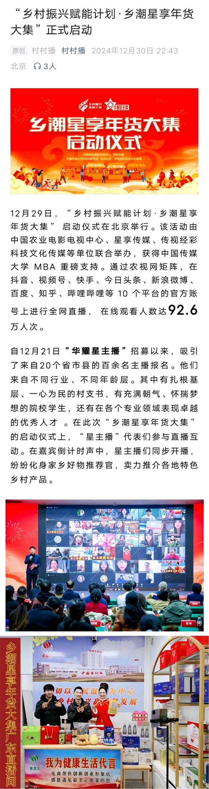 据了解,其依托中国网客户端、凤凰网客户端、中国早报、人民新媒网等500+媒体资源平台,累计发布乡村振兴主题报道,总传播量突破500万次。其中,《党建+乡村振兴+电商公益+AI+新媒体——连平县第十三届党代表陈漫获评“河源好网民”》等深度报道覆盖全国500余家媒体,《“融入现代生活 非遗正青春”广东河源市源城区2025年“文化和自然遗产日”非遗宣传展示活动圆满收官》及乡村振兴电商帮扶品牌活动报道触达345家媒体平台,单篇报道平均覆盖30余家媒体,有力推动了乡村文化与振兴成果的传播,助力乡村振兴高质量发展。