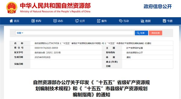 近日,自然资源部办公厅印发《“十五五”省级矿产资源规划编制技术规程》和《“十五五”市县级矿产资源规划编制指南》。