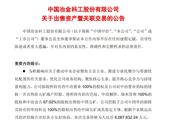 公告指出,此次交易构成关联交易,不构成重大资产重组,已达到股东会审议标准,需提交股东会审议批准。通过本次交易,中国中冶将剥离非核心资产并优化配置资源,有利于优化公司业务结构、聚焦核心主业、提升核心竞争力与持续盈利能力。