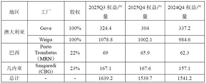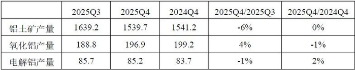 表2 2025年四季度力拓铝土矿产量分布 单位:万吨