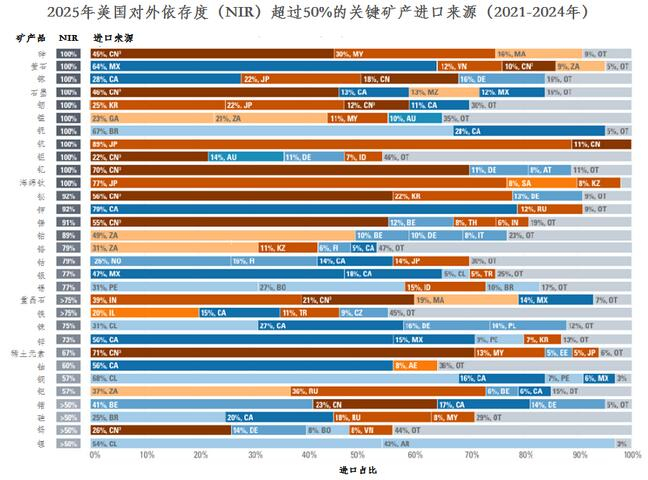 另外还有20种关键矿产净进口依赖度超过50%,低于2024年的28种,USGS称。