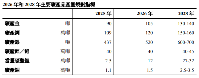 在公司“2026年和2028年主要矿产品产量规划指标”中表示,2026年预计矿产金为105吨、矿产铜为120万吨、矿产银为520吨。